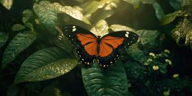 A Moment of Tranquility: A vibrant butterfly with wings of orange, black, and white rests on a leaf, bathed in warm sunlight