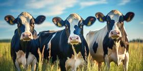 A Curious Herd: A group of Holstein cows gaze inquisitively at the camera from a lush green pasture under a bright blue sky