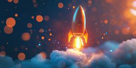 Ascent into the Unknown: A gleaming rocket ship blasts off into the cosmos, leaving a trail of fiery exhaust in its wake