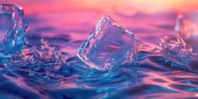 A Burst of Color: A vibrant purple ice cube shatters upon impact, sending a spray of icy shards and shimmering water droplets into the air