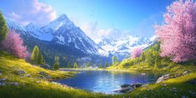 A Serene Mountain Escape: A picturesque lake nestled amidst snow-capped peaks, surrounded by a vibrant meadow of wildflowers