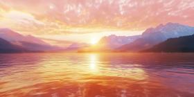 A Fiery Reflection: A dramatic sunset paints the sky with vibrant hues, mirroring the spectacle on the tranquil surface of a mountain lake
