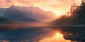 A Fiery Reflection: A dramatic sunset paints the sky with vibrant hues, mirroring the spectacle on the tranquil surface of a mountain lake