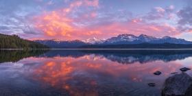 A Fiery Reflection: A dramatic sunset paints the sky with vibrant hues, mirroring the spectacle on the tranquil surface of a mountain lake