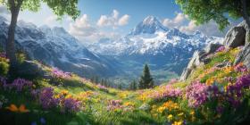 A Serene Mountain Escape: A picturesque lake nestled amidst snow-capped peaks, surrounded by a vibrant meadow of wildflowers