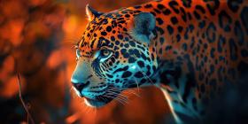 The Jaguar's Gaze: A majestic jaguar peers through the shadows, its piercing eyes reflecting the vibrant hues of the jungle