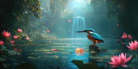 Kingfisher's Perch: A vibrant kingfisher surveys its domain from a branch laden with autumn leaves, the sunlight catching its iridescent plumage