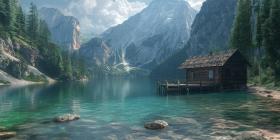 Serenity Amidst the Peaks: A tranquil mountain lake reflects the majestic snow-capped peaks, while a rustic cabin and a small boat add a touch of human presence to this idyllic scene