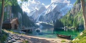 Serenity Amidst the Peaks: A tranquil mountain lake reflects the majestic snow-capped peaks, while a rustic cabin and a small boat add a touch of human presence to this idyllic scene