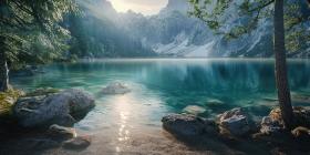 Serenity Amidst the Peaks: A tranquil mountain lake reflects the majestic snow-capped peaks, while a rustic cabin and a small boat add a touch of human presence to this idyllic scene