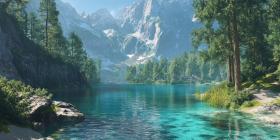 Serenity Amidst the Peaks: A tranquil mountain lake reflects the majestic snow-capped peaks, while a rustic cabin and a small boat add a touch of human presence to this idyllic scene