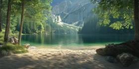 Serenity Amidst the Peaks: A tranquil mountain lake reflects the majestic snow-capped peaks, while a rustic cabin and a small boat add a touch of human presence to this idyllic scene