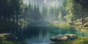 Serenity Amidst the Peaks: A tranquil mountain lake reflects the majestic snow-capped peaks, while a rustic cabin and a small boat add a touch of human presence to this idyllic scene