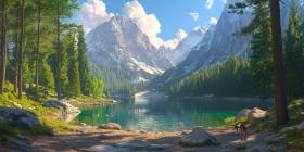 Serenity Amidst the Peaks: A tranquil mountain lake reflects the majestic snow-capped peaks, while a rustic cabin and a small boat add a touch of human presence to this idyllic scene