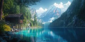 Serenity Amidst the Peaks: A tranquil mountain lake reflects the majestic snow-capped peaks, while a rustic cabin and a small boat add a touch of human presence to this idyllic scene