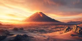 Volcano's Fury: A majestic volcano erupts against a fiery sunset, casting a dramatic glow over the surrounding desert landscape