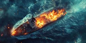Infernal Sea: A burning cargo ship battles a raging storm, flames engulfing the vessel against a backdrop of churning waves.