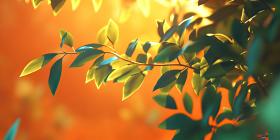 Golden Hour Glow: Sunlight filters through lush green leaves, casting a warm, golden light on the scene