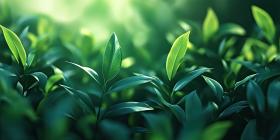 Golden Hour Glow: Sunlight filters through lush green leaves, casting a warm, golden light on the scene