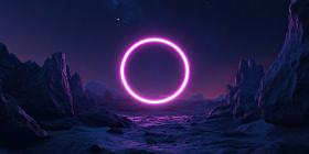 Portal to the Unknown: A glowing pink ring hovers over a desolate alien landscape, beckoning the explorer within
