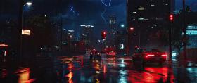 Neon Reflections: A Rainy Night in the City, where neon lights cast a vibrant glow on the slick pavement, and the rhythm of the falling rain echoes through the bustling streets