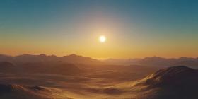 A Distant Horizon: A breathtaking alien landscape bathed in the golden light of a distant sun, with a starry sky stretching endlessly above