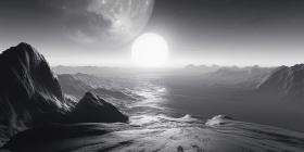 A Distant Horizon: A breathtaking alien landscape bathed in the golden light of a distant sun, with a starry sky stretching endlessly above