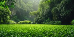 A Verdant Oasis: A sun-dappled meadow stretches towards a horizon framed by a canopy of lush green trees, inviting you to escape into a world of tranquility and natural beauty