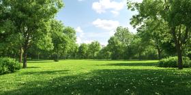 A Verdant Oasis: A sun-dappled meadow stretches towards a horizon framed by a canopy of lush green trees, inviting you to escape into a world of tranquility and natural beauty