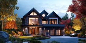 A Majestic Residence: A grand estate with elegant stonework, soaring windows, and manicured landscaping, commanding a presence on a picturesque property