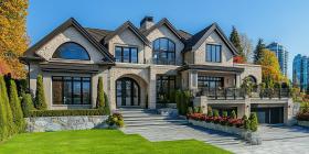 A Majestic Residence: A grand estate with elegant stonework, soaring windows, and manicured landscaping, commanding a presence on a picturesque property