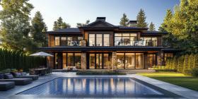 A Majestic Residence: A grand estate with elegant stonework, soaring windows, and manicured landscaping, commanding a presence on a picturesque property