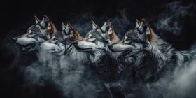 Guardians of the Mist: A pack of wolves emerges from the swirling fog, their eyes gleaming with intelligence and power