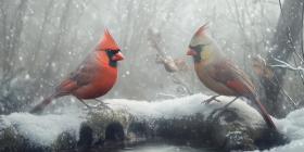 A Winter Tale: Two vibrant cardinals share a moment amidst a flurry of snowflakes, their crimson plumage a splash of color against the wintery backdrop