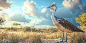 A Majestic Presence: A Kori Bustard surveys its domain, its regal stance and striking plumage commanding attention against the backdrop of a vast African landscape