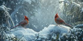 A Winter Tale: Two vibrant cardinals share a moment amidst a flurry of snowflakes, their crimson plumage a splash of color against the wintery backdrop