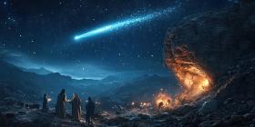 Nighttime Scene with a Bright Comet Illuminating the Starry Sky over a Historical Gathering of Robed Figures and Animals, with a Fire-Lit Cave in a Rugged Mountainous Landscape