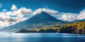 A majestic volcanic peak rises dramatically from the ocean, shrouded in clouds against a vibrant blue sky