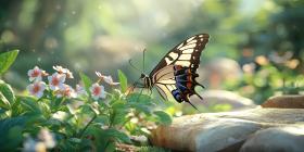 A vibrant swallowtail butterfly with intricate patterns rests on a delicate white flower, its wings spread wide in the warm sunlight
