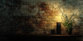 Spotlight on Brick: A beam of light pierces the darkness, illuminating a textured brick wall with a dramatic spotlight effect