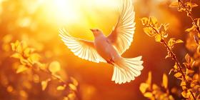 Wings of Freedom: A white dove soars through the air, bathed in the warm glow of the setting sun, symbolizing hope and liberation