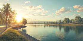 Serene Waters: A tranquil lake nestled amidst a picturesque forest, reflecting the vibrant hues of a sun-drenched sky