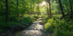 Serene Waters: A tranquil lake nestled amidst a picturesque forest, reflecting the vibrant hues of a sun-drenched sky