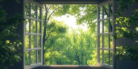 A Glimpse of Nature: An open window frames a lush green landscape, inviting a breath of fresh air and a sense of serenity
