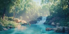 Serene Waters: A tranquil lake nestled amidst a picturesque forest, reflecting the vibrant hues of a sun-drenched sky