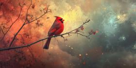 Crimson Majesty: A vibrant cardinal perches gracefully on a bare branch, its fiery plumage contrasting against the muted hues of the winter sky