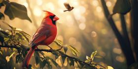 Crimson Majesty: A vibrant cardinal perches gracefully on a bare branch, its fiery plumage contrasting against the muted hues of the winter sky