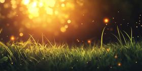 A vibrant field of lush green grass basking in the warm glow of the setting sun, with a bokeh effect adding a touch of magic