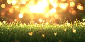 A vibrant field of lush green grass basking in the warm glow of the setting sun, with a bokeh effect adding a touch of magic