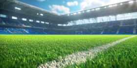 A close-up view of a freshly cut soccer field, with the white lines marking the pitch and a vibrant blue stadium in the background